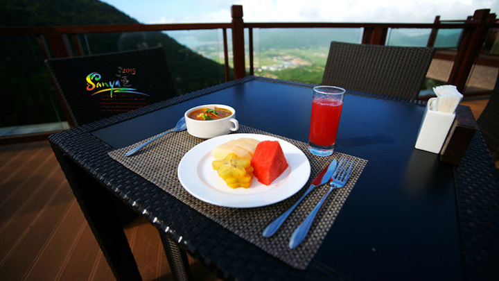 云顶阁餐厅的外景开始清晰可见,山下是壮观的亚龙湾海湾的风光,云层开始散去,水天一色的感觉逐渐加强……