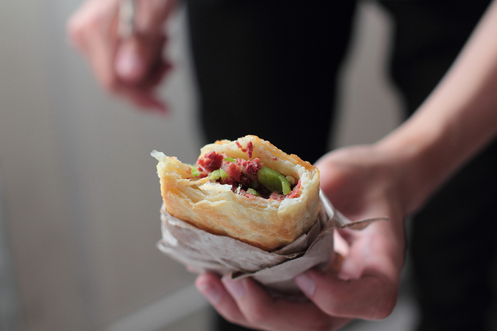 最后奉上今天的午饭!河间驴肉火烧,进入河北后,到处都能看到驴肉火烧的店,今天和布布骑车的时候就念叨着一定要尝一尝。在宁河县医院斜对面有一家店铺名字很长的驴肉火烧店,老板娘长的非常温柔,号称自家店铺已经开了十年,火烧也确实非常好吃,火烧皮十分酥脆,驴肉加上切碎的尖椒,香而不腻,我和布布一共吃掉四个,非常满足。