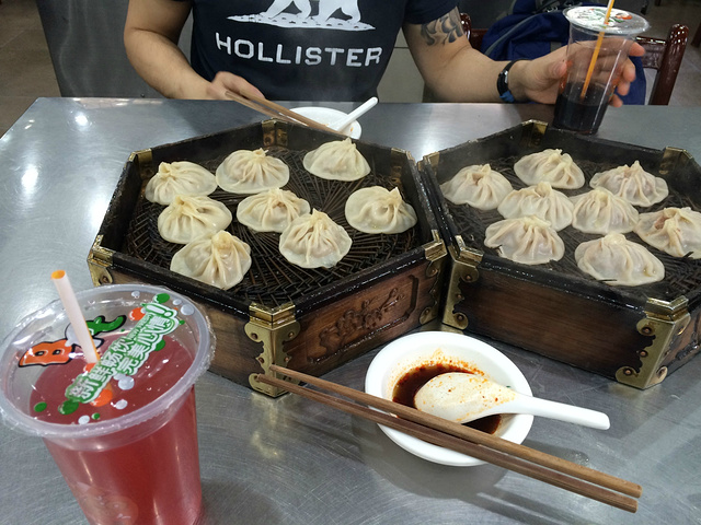 对面坐着Daniel,一起点了两笼灌汤包,牛肉和三鲜,汁多馅大,喝上一口石榴汁和酸梅汤,简直绝配!
