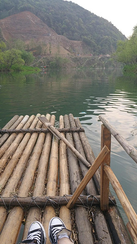 水很清亮,我在竹筏子上~~看见前面那座山了吗,有一大块很不协调的土色了吗,那就是塌方的,土都在公路上,正挖呢。