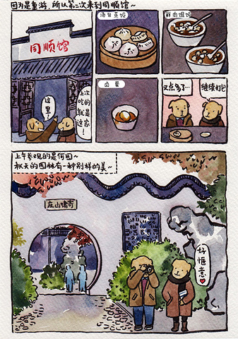 第一站,我们来到了同顺馆吃早餐:汤包蒸饺,虾籽馄饨外加一颗卤蛋。味道正,分量足。 能量满满的我们就来到了附近的何园。