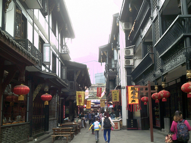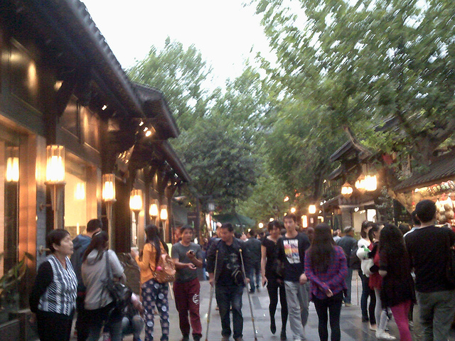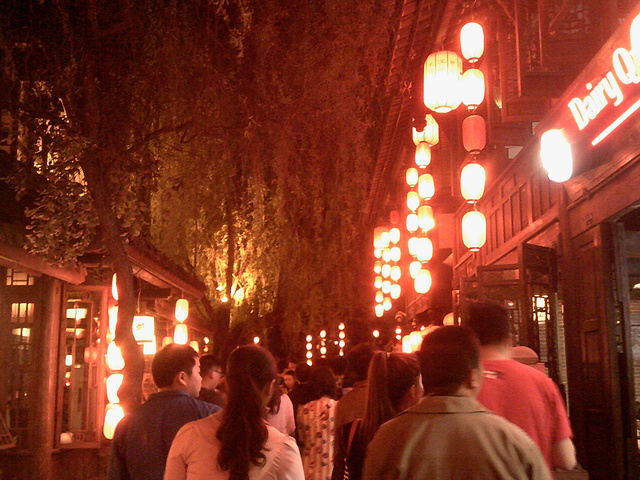 宽窄巷子后坐公车到锦里,到锦里时已经是晚上,人声鼎沸,连挤进个门口也挤了半个小时,锦里分几条岔道口,橙黄色的灯笼整整齐齐地排满每一条街道,从几间酒吧传来的歌声和店铺的叫卖声交杂着,形成了锦里的夜。
