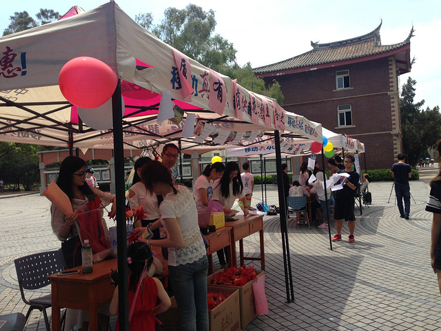 这次正好碰上一些学生活动,这个是一个收集木棉花的行动,校园里有很多的木棉花掉落,学生们开展了拾木棉花换明信片的活动,很多家长也会带着孩子去拾花。
