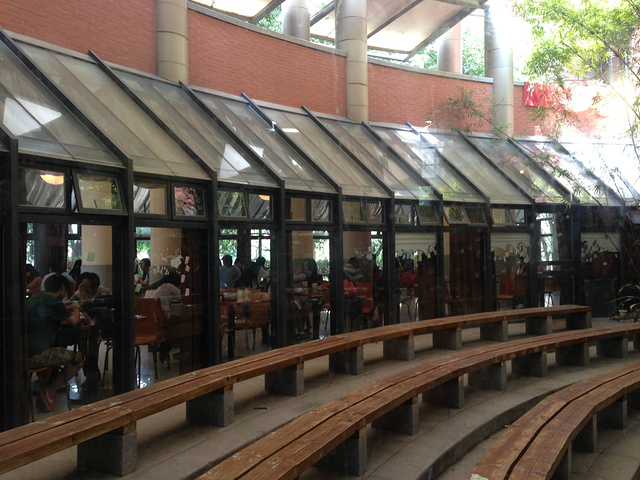 大学生活动中心里面还有一个咖啡厅,很多学生会买一杯咖啡然后在里面看书,也是别有一番情调的。在咖啡吧外有很多的长凳,还有一个小舞台,我猜平时一定会有很多人来这里进行小型的表演。