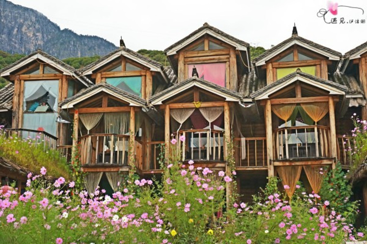 传说中的五彩里阁,和其他客栈的建筑外形相比,确实很吸引人,门前大片的格桑花。