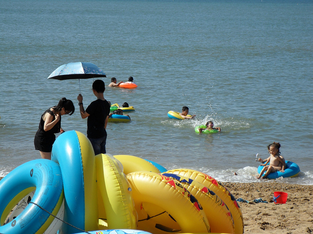 (我个人建议这时来海边玩水正是好时候,但这里的水很深一定要带泳圈,我们带了一个大圈一个小圈,小圈基本用不上,后来又租了一个大圈20元呢)
