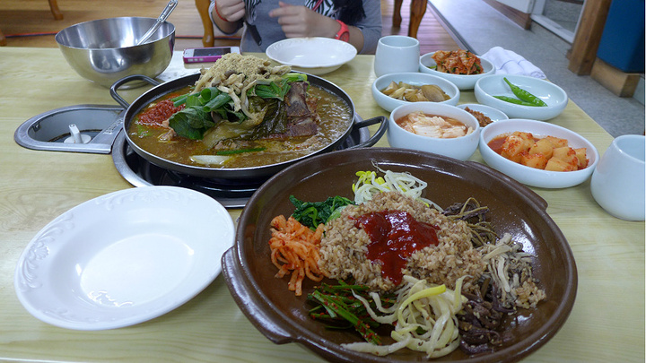 早上7点半左右起来,8点出去寻早饭,想看看这里人早饭吃什么,进了一家店,打开菜单傻了,都是像正餐的那种饭和汤,没有馒头粥什么,而且选择哈少,就两面。我朋友点了个小份肉骨汤,我点了山菜拌大麦饭,每顿都有6个小冷盆,豆芽,茄子,红烧土豆,糖醋洋葱,海藻之类,每家店不一样,味道都不错。这顿早饭是几天来最贵的,2万6千元。那个小份肉骨汤超大,可以两个人合吃了,我的饭量也不小,这家店真心量大,后面来了几个游客看到我们早饭的量也目瞪口呆了,那天撑了,中饭省了。