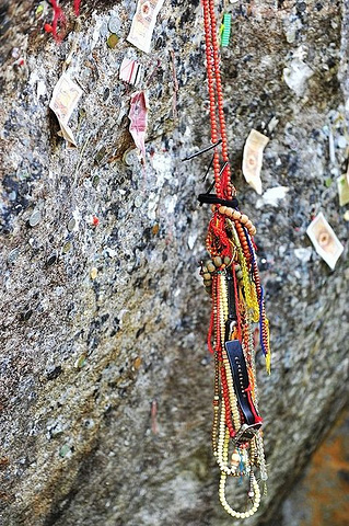 石头上有好多钱,旁边还有念珠、手表、书、照片等好多人留下来的东西。
