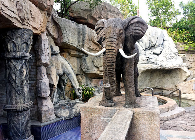 整个火山岩矿温泉区,包括亚洲、大洋洲、美洲、欧洲和非洲等五大洲主题区,建筑风格也选当地标志特色建筑,有种来到世界之窗的感觉