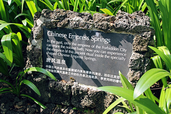 亚洲区的豆蔻泉有防暑祛湿作用,豆蔻本身有行气温中,化湿消痞的功效,配合42摄氏度的火山矿温泉,达到药用的效果