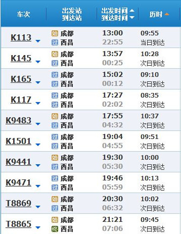 这是在12360上可以查到的成都到西昌的列车时刻表,列车票一定要尽可能提早预订!因为人多票少