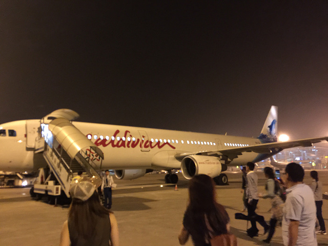 我们坐的是旅行社与马代国航的包机,Q2航班,优点是时间短,飞机上总时间大约7个多小时,其中还包含在曼谷经停加油的45分钟。缺点是来回都是夜航,休息不好,但来回都可在飞机上看日出,也挺震撼的。