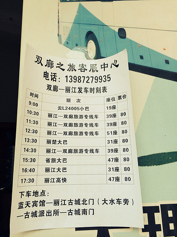 来回都是坐的飞机,在去哪儿网订的,这里要说的是买飞机票时一定要注意它的准点率,因为我们去的时候坐的那趟飞机准点率不高所以多花20元买拉延误险,结果延误拉3个小时46分钟,真是想哭拉,一直等到快晚上十二点才登机,不过第三天的时候保险公司理赔拉300元(飞机延误超过两个半小时以上理赔300元,你什么都不用管,一般一到三个工作日保险公司会发来链接让你输入卡号,即时到账)。云南这边交通费这一块花的比较多,景区相隔都还蛮远的,从飞机场到丽江古城要花四十分钟,如果运气好可以和别人拼车要划算点,机场大巴是20元一人,好像只到蓝天宾馆,不到古城,还要花10元的打车费,如果是一个人的话可以选择机场大巴,两人或两人以上还是选择包车吧,一般如果你提前订好客栈,和客栈老板联系好,不管多晚老板都会联系师傅来接机,费用是80元。如果你要从丽江去大理,双廊,泸沽湖可以选择跟团挺便宜的,可以直接在去哪儿团购,也可以让客栈老板帮你联系。不想跟团的可以坐专线车,泸沽湖是160元一人,从丽江到泸沽湖要坐7小时左右汽车,因为太远我们行程不够,所以先问清楚拉准备下次去。我们是直接跟团去的大理,从大理蝴蝶泉包车去的双廊,费用是80一车,也可以拼车。然后在双廊坐的80元一人的汽车回到丽江(车程两个半小时),不用担心联系不到汽车那边基本每家客栈都会在门口写个牌牌双廊到丽江时刻表还有价格。如果你是住在双廊码头这边,联系师傅时让他喊三轮车来接,不用另外花钱,不然你就要坐电瓶车到古镇门口才能坐大巴,电瓶车费用10元/人,去的时候也是只到古镇门口,步行15分钟才到码头,或者坐电瓶车进去。