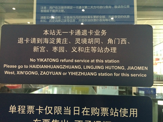 到达北京,买了两张交通卡,50元一张(20元押金,30元充值)。但是北京的交通卡不是每个站都可以退的,记住以上几个站才能退哦,所以最好离开北京前一天就退。现在公交地铁都提价了,30元完全不够用,我们每个人总共花了50元交通卡
