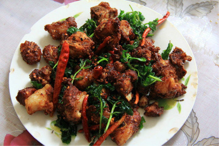 这排骨炸得酥透,带上辣椒和薄荷的香气很是好吃啊!