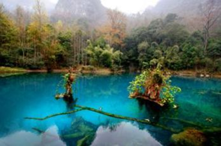 卧龙潭围绕在一片高山之间,潭水如面平静的镜子,颜色也蓝得动人。