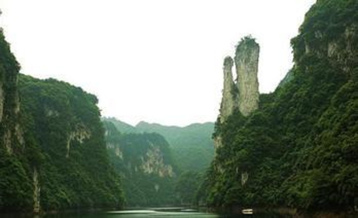 游船在峡谷水道间蜿蜒前行,天门洞、唐僧师徒峰、将军柱、三叠水瀑布、孔雀开屏 、火烧赤壁、腊肉崖、一线天……一个接一个风光应接不暇,一湾一画,一步一景,美不胜收。