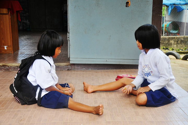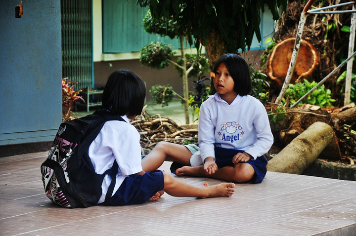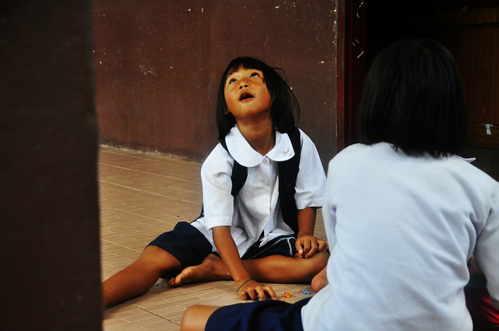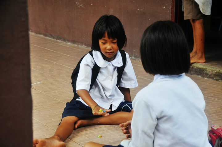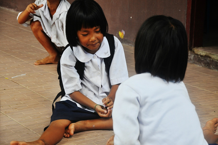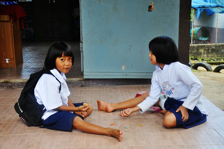 这两个小女孩在玩类似国内“扔嘎拉哈”的游戏