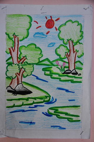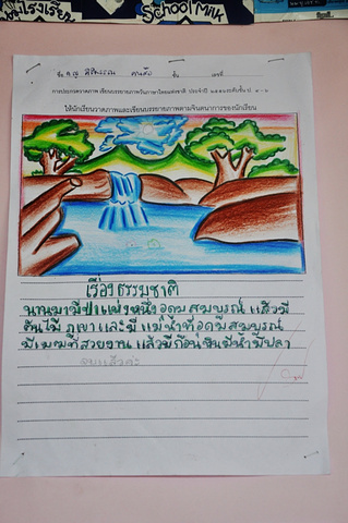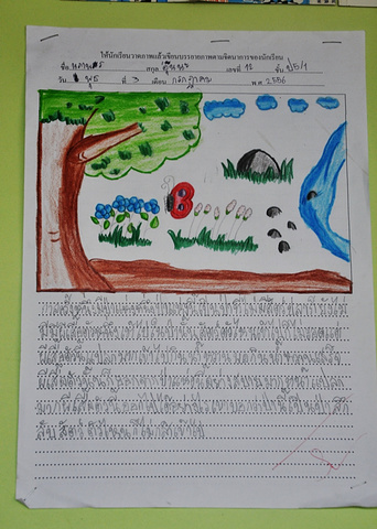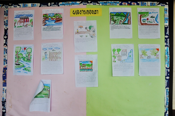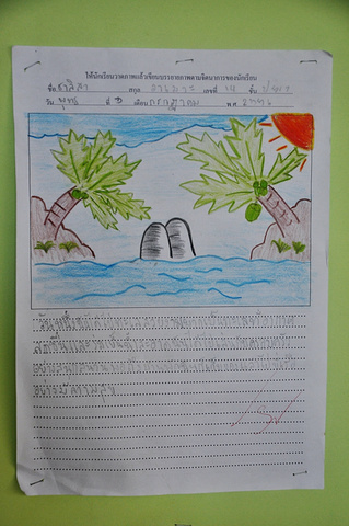 每个班级的墙上都贴着孩子们自己画的画和字 画的真不错