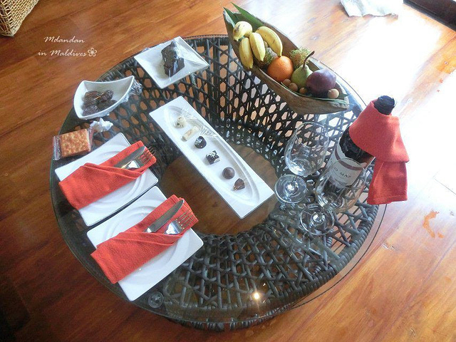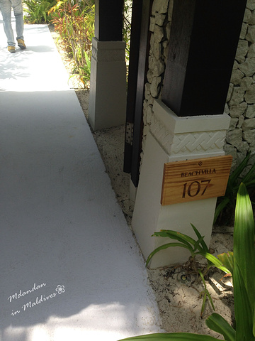 这就是我们的沙屋了。107号房,大家再订酒店的时候要提前告诉她们要求住比较靠前的沙屋,因为岛上有个柴油发电机,所有岛上的电,都是从那发出来的,柴油味比较重,所以住比较靠前的沙屋比较好,我们住的就闻不到柴油味!