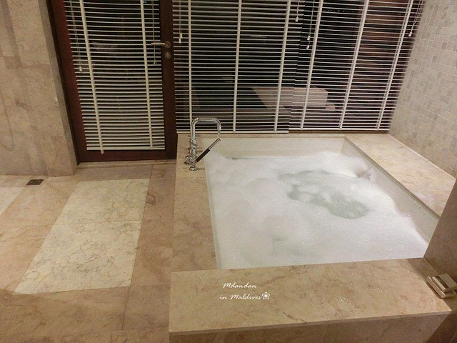 这个是送的蜜月花床和泡泡浴,一定要提前和管家说好什么时候需要,一般是在最后一个晚上,有的岛好像是第一晚,这个不一样,!在白天的时候要提醒自己的管家哦,我们折腾了半天,就是因为老公的英语水平。。然后到晚上9点多才弄好。