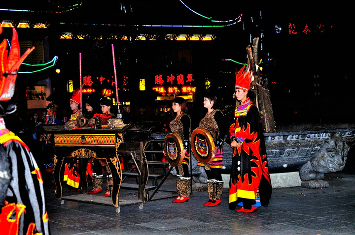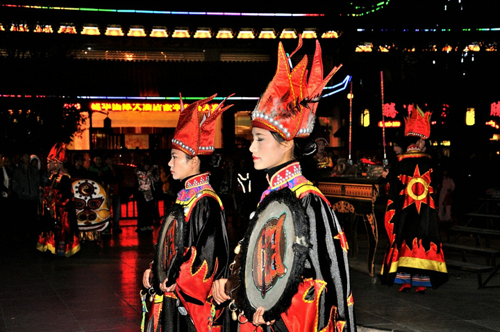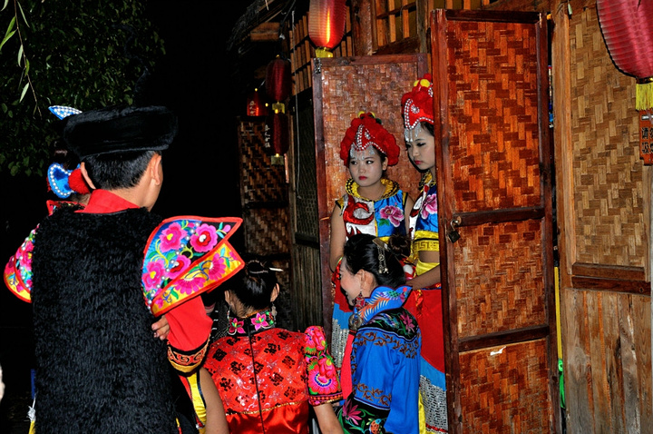 晚上用过了长街宴后,我们参加了彝族的祭火大典.(火把节是8月14日,而今天是8月11日,临近这次盛典了,彝人古镇里也都装扮好了)。