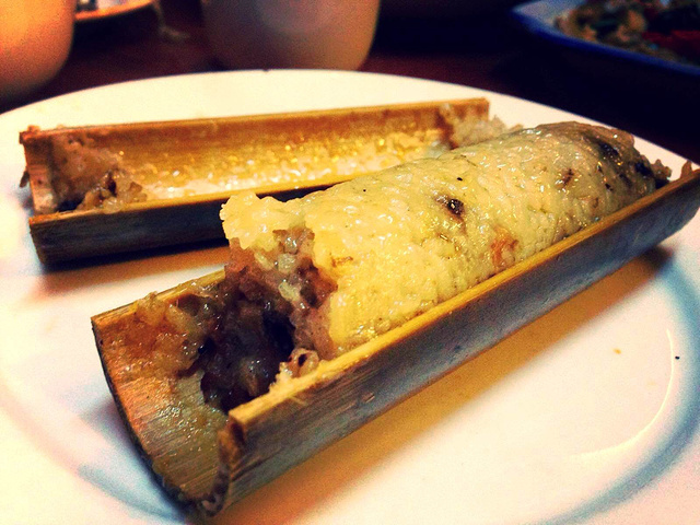 在遍地竹林的阿里山区,竹简饭是其特色小吃,尤其广为当地邹族族人所爱;传统的做法是以桂竹的竹筒内装生糯米,再以高丽菜或山酥塞住筒口后炭烤,一会即可闻到浓浓的竹香,待烤熟后即拨开竹筒,长条的白饭外围裹着一层透明的竹膜,桂竹的清香混合着饭香扑鼻而来,香Q可口。若配上阿里山特产哇沙米加酱油的沾酱,即是风味十足的邹族美食。