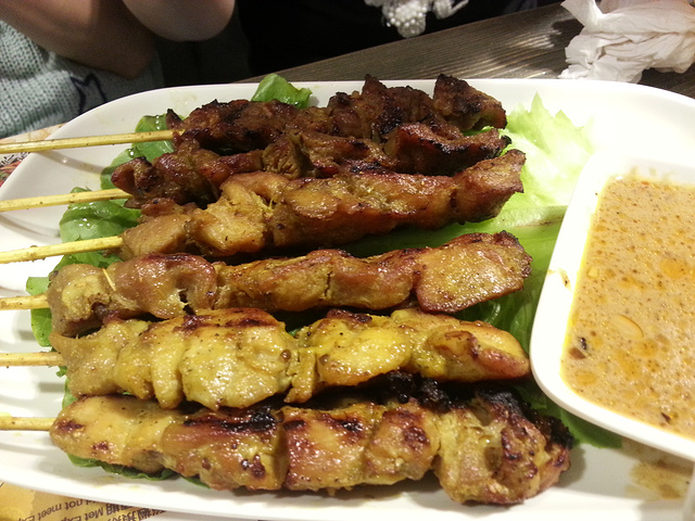 沙爹是传统马来美食,就是南洋风味的烤肉,但味道和中国的烤肉味道完全不同,它是传统的马来食品,是将腌制好的牛肉、鸡肉、羊肉在炭火上烤,蘸上由花生酱、椰酱、幼虾调制而成的沙爹酱,味道很香醇。如果再配以用椰子叶包裹的马来米饭再加上小黄瓜和洋葱,沙爹的味道会更浓,吃了肯定令人眷恋不已。