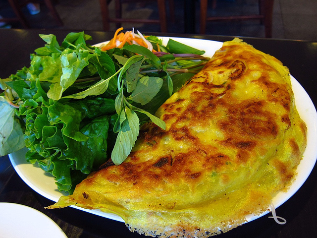 Banh Xeo 是起源于越南中部的一种煎饼,首先把粘米粉、姜黄粉等放在一个小锅里面煎,中间放上虾、猪肉、豆芽、洋葱等。“Xeo”在越南语里表示油煎时候发出的那种声音。吃的时候用蔬菜或者春卷皮裹起来,蘸鱼露或者花生酱汁。脆脆的煎饼皮配上里面软软的各类配料,再融合了可口的酱汁,味道好极了。