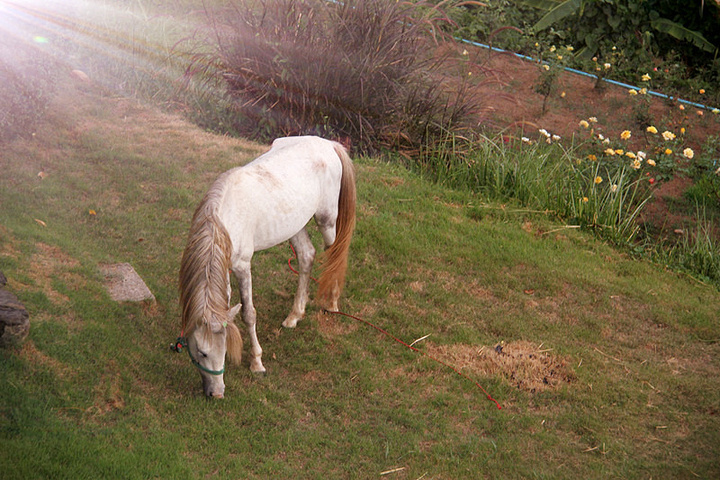 来之前,从朋友的描述中,浪漫清新是拜城的主色调,果真如此,在这个地方,我很少看见穿梭于繁华都市的汽车车流,倒是不少摩托车,自行车三三两两奔来跑去的身影。我们当然也不能成为这道风景的另类。无论是在清迈还是在拜城,大街小巷都能容易的看到摩托车和自行车的出租店,喜欢自在的旅行者们都愿意花点儿并不多的租金祖上一辆车,背包里装上一张容易识别的地图,快乐的游走在风景优美的乡间公路上。我们住的这家别墅旅馆,老板也周到的备有供客人租赁的摩托车,我们选了其中的一辆,余同学也不负期望,仅以5分学会的学习记录得到了华裔老板的大拇指夸赞。