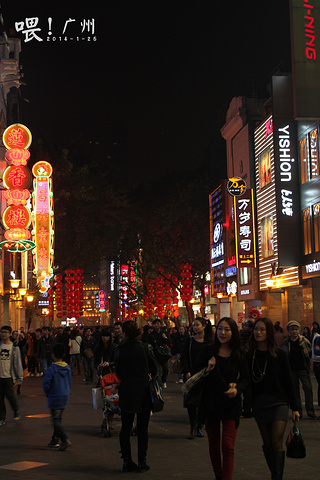 是广州最繁华的商业区步行街之一,从南到北满满分布着各个服装品牌店、茶餐厅、百货公司、餐饮、娱乐一应俱全,人气非常旺。广州街头还有一个很特别这一看有些惊人的场面,就是在街头巷尾总是有一些老太拿着一根细线在帮一些女士刮脸,大概是一种古老的美容方法。 在步行街的截止位,有一栋很显眼的五层红色的小楼,外边有招牌写着“歌利娅”,但它里面不是买女装的,里面反而有很多老广州文化的东西,还会有不定期更新的展览,绝对推荐小资、伪小资、小清新、文艺青年们入去转转。