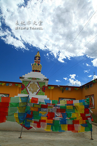 蓝天白云配上白塔和经幡。