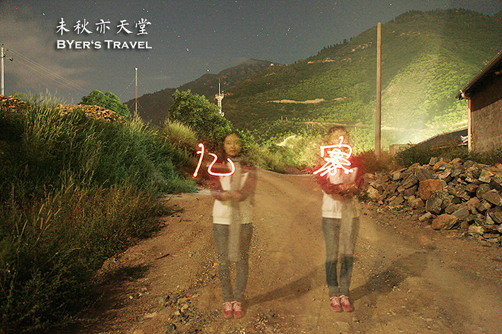 就这样,大叔看着我俩在这儿对着三脚架傻站着拍照,足足看了50分钟-__-。目睹了整个事件的藏族师傅说,这是他见过最无聊的两个人>_<。最奇葩的是,因为要玩光绘,加上天色很暗,必须留足够长的曝光时间,所以我们需要保持一个姿势很久才能出现这样的画面。但长时间一动不动不太可能,所以我和猪流在照片中显得都有些虚,而我们的大叔,以围观者的姿态,竟然惊人的呈现了一个巨清晰的影像,有图作证……我泪奔了,这是站得有多稳,看得有多专心-__-|||。
