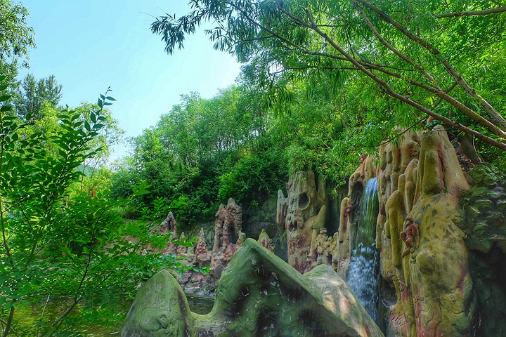 寺庙下一滩清泉,水流不息,可穿过洞中看水外风景,悟空用宝瓶吐水,很似水帘洞中之感。