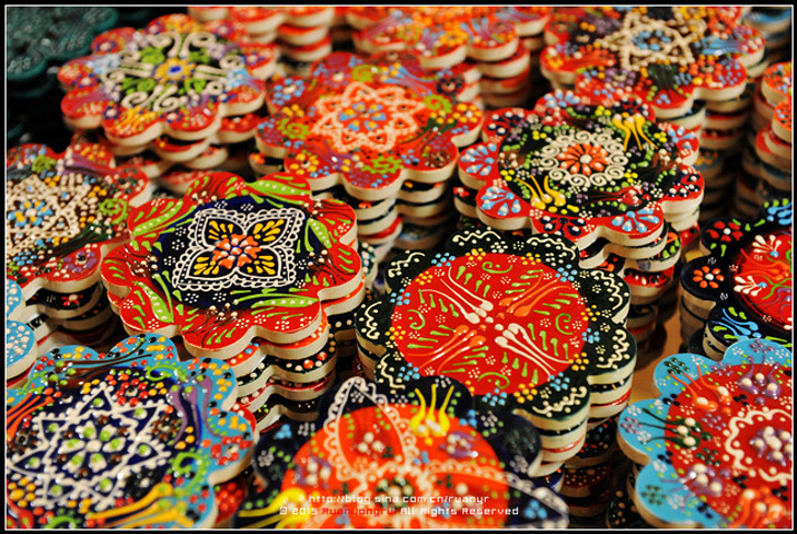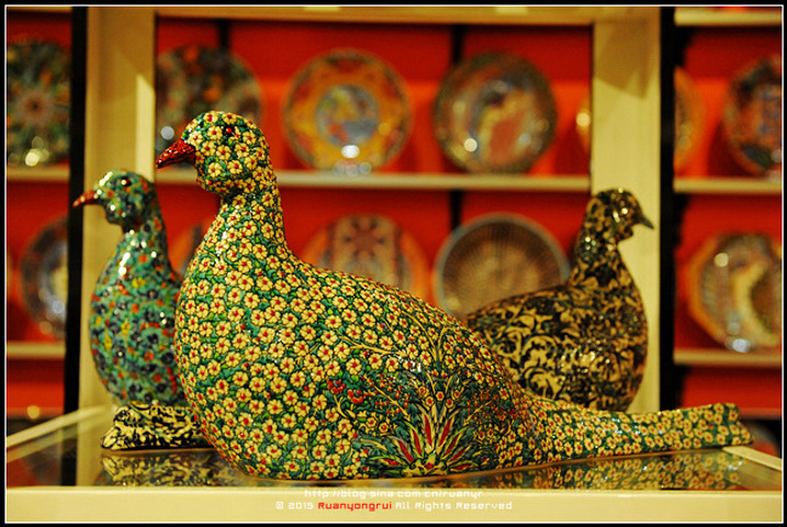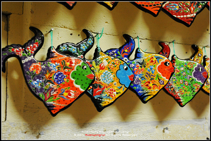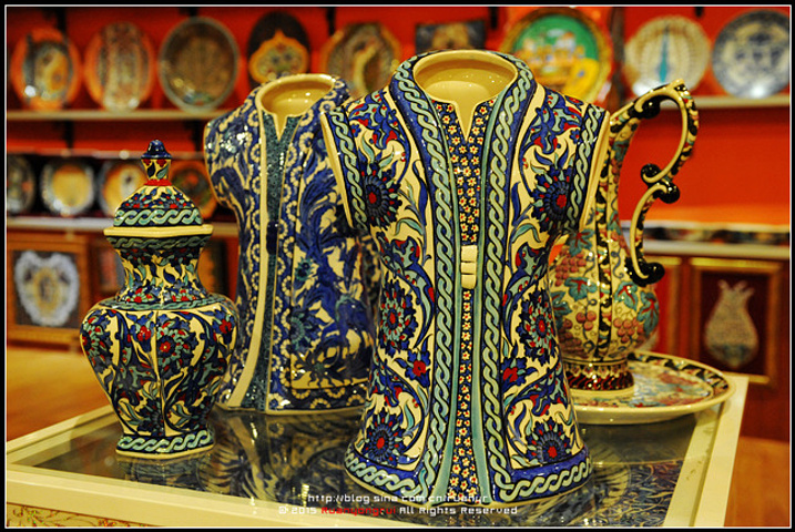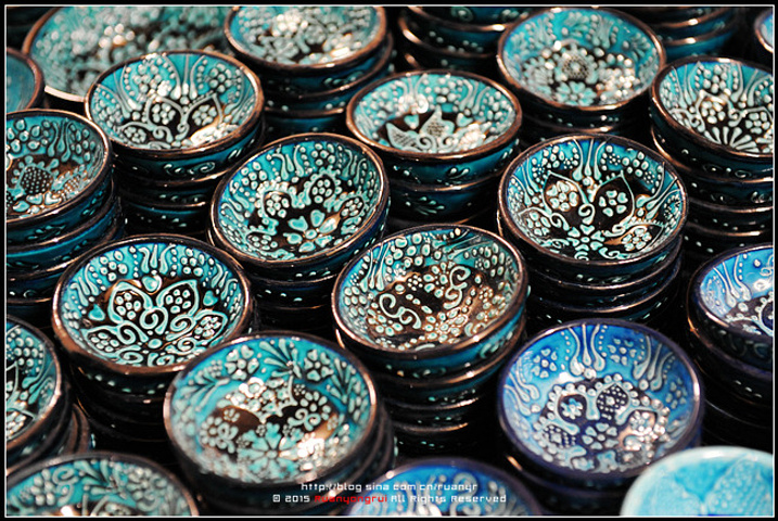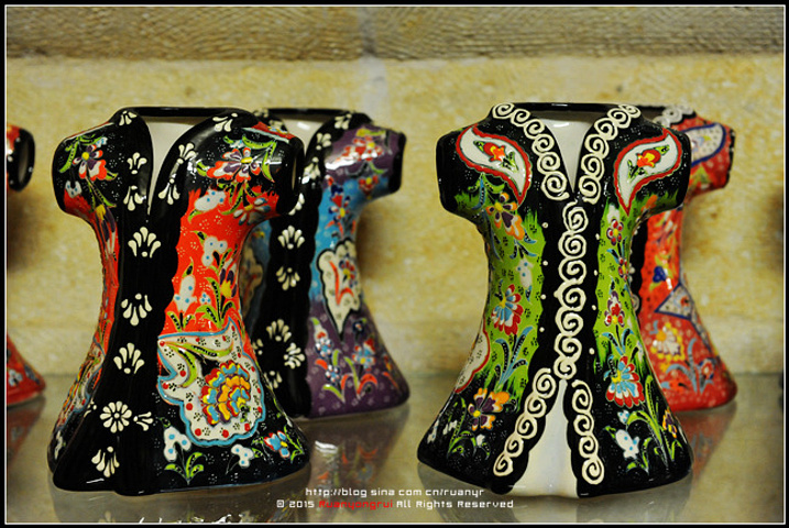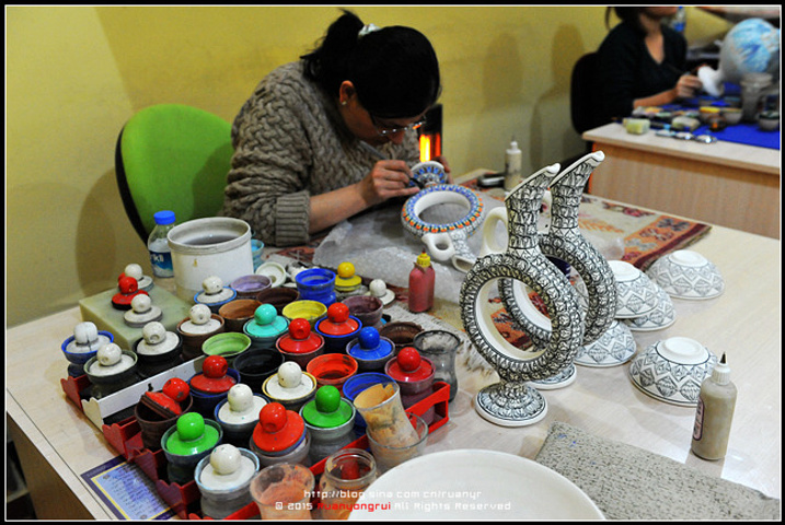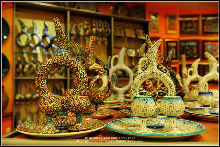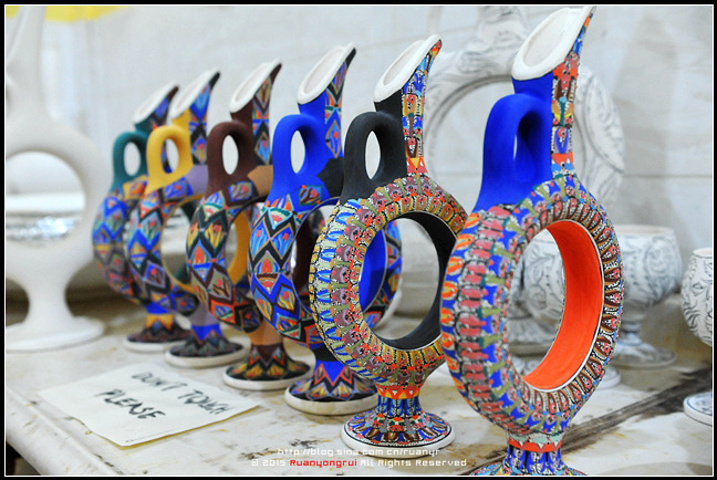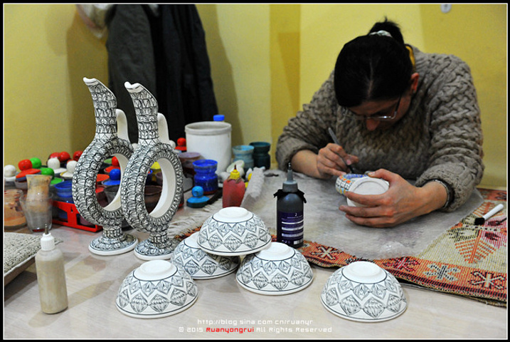 已经填满色彩等待第二次烧制的酒壶,虽然它们的图案各不相同,但蓝色几乎是所有酒壶的颜色主题,土耳其人是多么的喜欢蓝色呀!