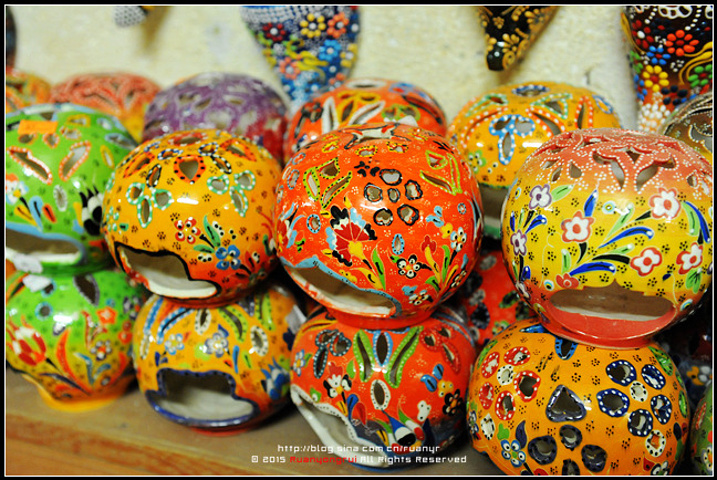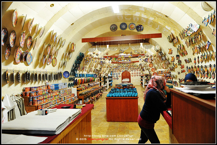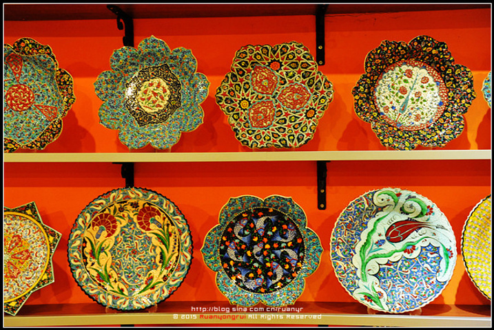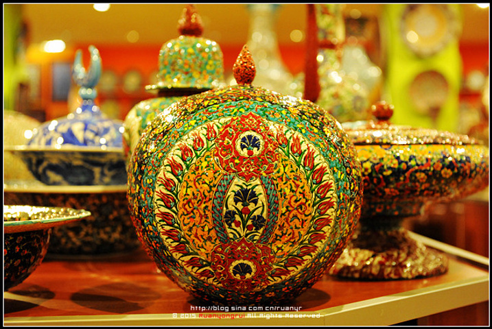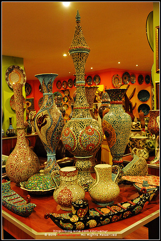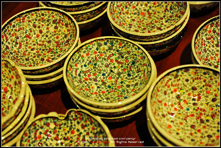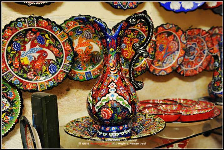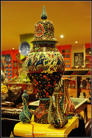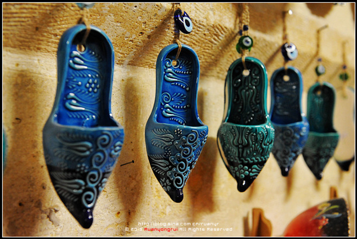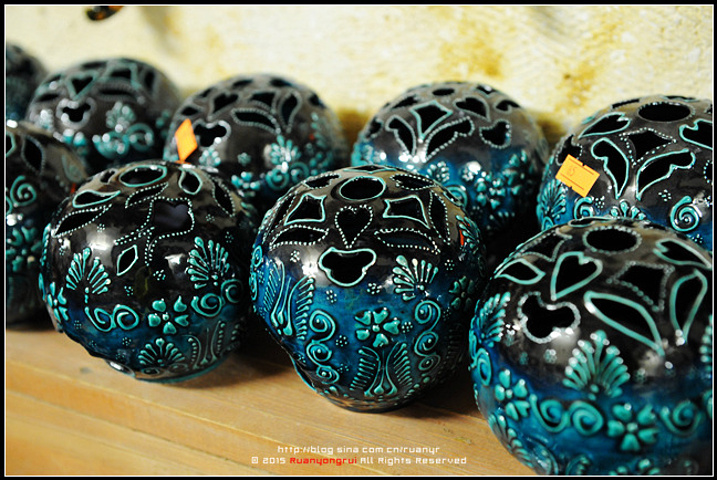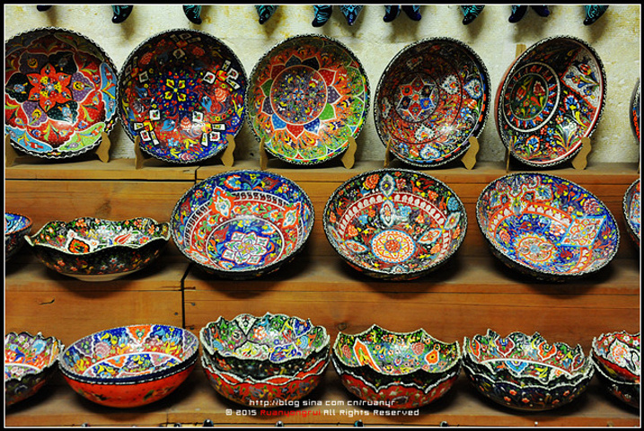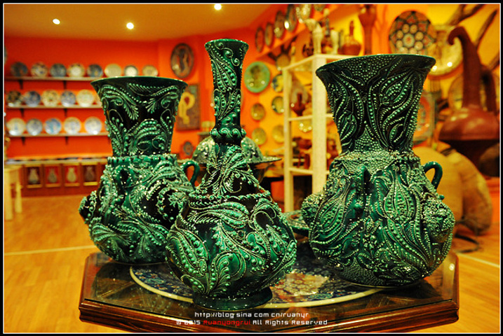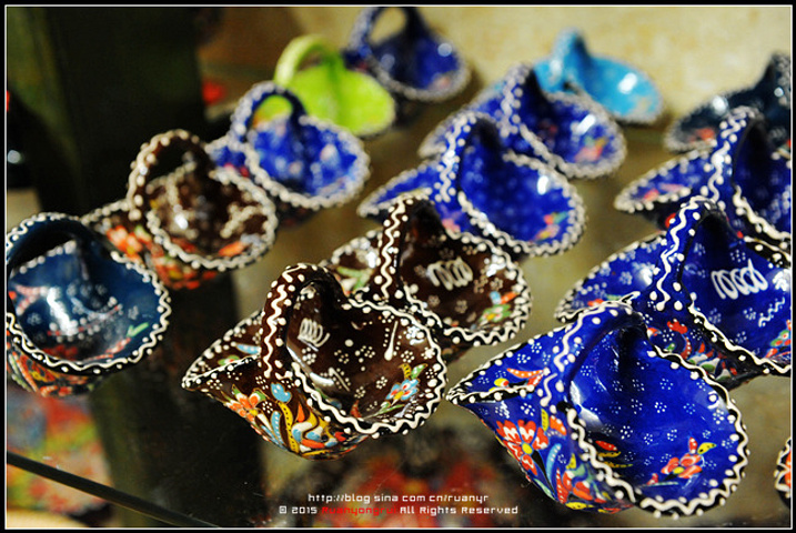 位于卡帕多西亚地区格雷梅小镇北边的阿凡诺斯小镇犹如中国的景德镇,它是卡帕多西亚地区,甚至是整个土耳其,乃至中东地区最著名的陶器小镇。土耳其境内最长的河流克孜勒河流经这里,因为河水泥浆中含有丰富的铁质,所以河水泛出淡淡的红色,这条河也被称作“红河”,这也是当地人以红河水和河里的泥浆作为原料烧制出的陶器的最大特点。阿凡诺斯陶器的制作工艺和花纹设计代代相传,某些制陶技术甚至可以追溯到赫梯王国时期。这里一般的陶器并不上釉,保留着泥土本来的颜色,而用来装饰的陶碟、陶罐则多半采用了绚丽的色彩,这其中尤其以土耳其人喜欢的蓝色居多。