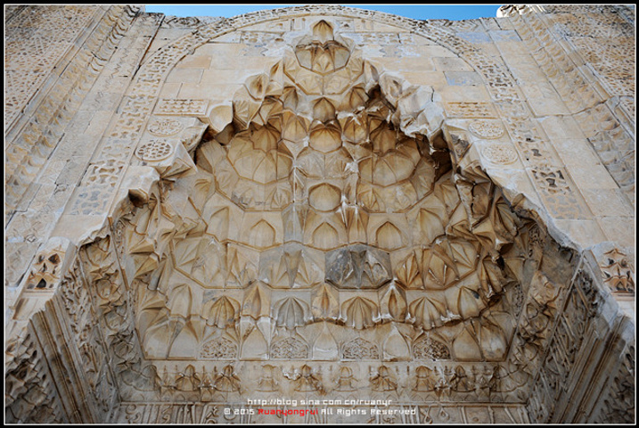 尖拱造型如同放大了的壁龛,由精细的花瓣和复杂的几何图形构成,赛尔柱文字雕带点缀其中