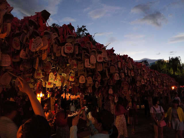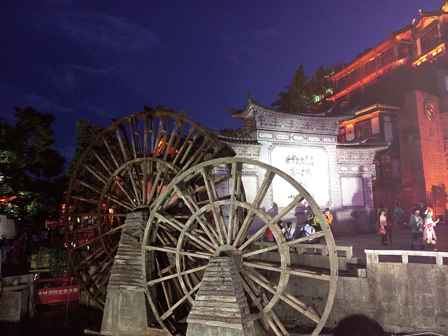 回去了晚上就转了转丽江古城大水车,门口的许愿的牌子。里面跟大理古城差不多,但感觉丽江还是要管理比大理好,至少古城内没有车辆穿梭。还有一个重要的事,那个到丽江的“古维费”如果您是不去玉龙雪山、狮子山公园、丽江千古情什么的就不必买了,毕竟是80块钱,听说明年开始大理也要开始收这个古维费了,真搞不懂我们是过来拉动你们经济发展的也没怎么样收这个古维费是什么个意思。第二天就去了丽江千古情,网上有团购的票,也有千古情发的班车凭票上车,这个千古情是个系列包括九寨千古情、丽江千古情、三亚千古情、宋城千古请,都说是一生必看的演出,自然见仁见智我个人就认为这个没有云南印象好看,这个完全就是靠声光电的搭配到一个恢弘的场面,而云南印象则是从各个民族挑选出来的用本民族近似原汁原味的东西带我们不一样的震撼,但我认为都值得去看一看。