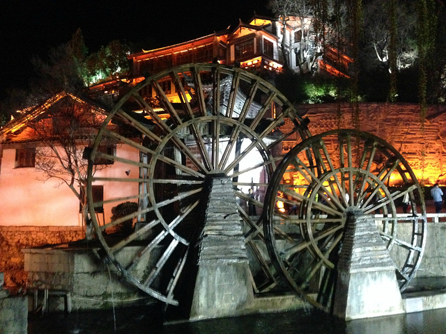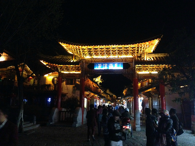 晚餐在客栈老板推荐下,去了一家连锁的黑山羊店,同时点了腊排骨,也算是当地美食都品尝了。事实证明,虽然大店生意超兴,但是口味也就一般,路边有些本地人吃饭多的小店可能口味更正哦!饭后带范范古城逛逛,标志性的大水车一定要看一看。大研的酒吧太多太闹了,两个人都不想去,便只逛逛就想回客栈休息了。