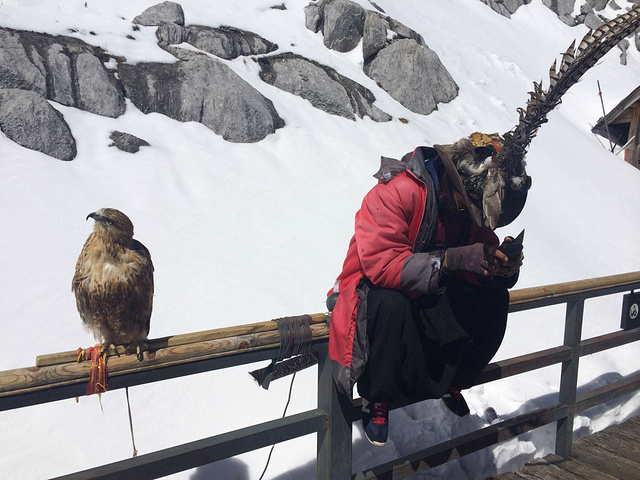 傲娇的鹰,雪山上供游人拍照。