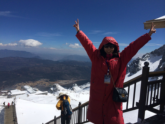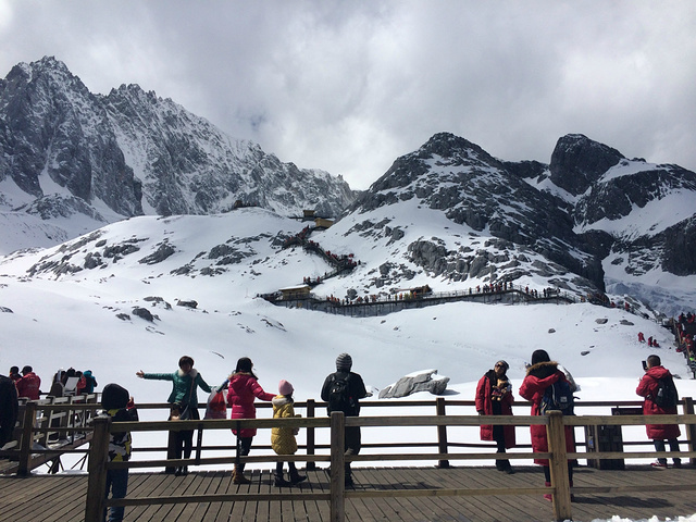 带着忐忑与激动向雪山一步步靠近,在雪山附近,导游为我们每人发放了羽绒服和两瓶氧气罐。终于到达雪山底下,导游与在景点售票处负责订票的经理打电话,告诉上山人数。过了两分钟,导游接到电话,山上风大,雪山大索道关闭。车里一阵唏嘘,正商量着哪些人要退票哪些人改换景点时,导游又接到电话,我们的电子票已经打印出,票已出的可以上山。哦也!人生未免太多惊喜了,于是屁颠屁颠上山去大索道区排队咯!