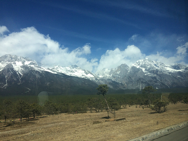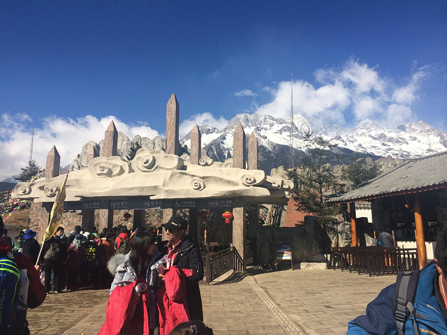 早上约好9点纯玩团大巴集合,在走向约定地点的路上,遇到两当地司机,告诉我们刚刚他们联系雪山售票点,现在山上风大,上山缆车未开。这让我们有点点紧张,但是不前去看一下怎么知道。顺利与导游接头,王敏导游是个很幽默的当地小伙,在车上他安慰我们目前玉龙雪山大索道是开放的。