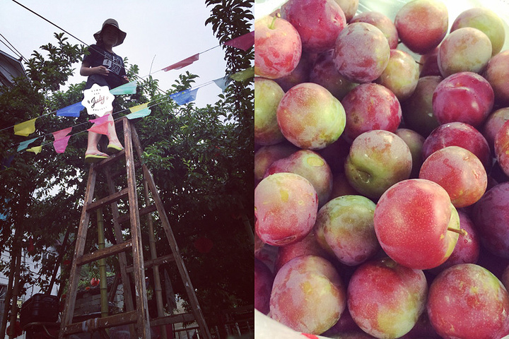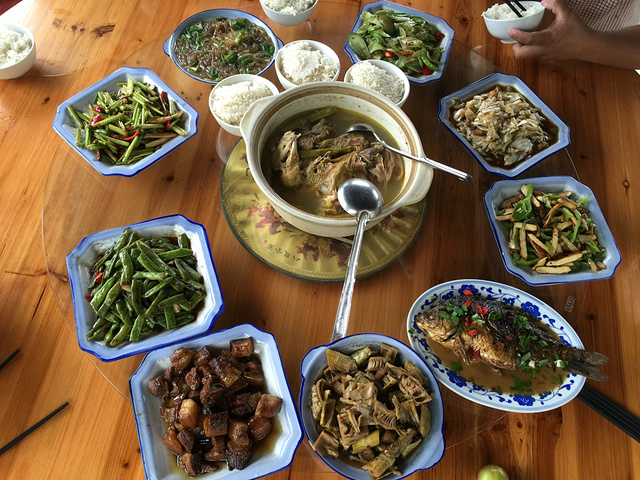 也许这就是传说中的世外桃源了,湿哒哒的石板路、木质的栅栏、矮矮的瓦片房、涯边的木屋、一路尾随的狗狗、农家自己种的果蔬。。。(今夜留宿的山顶上的小木屋客栈)