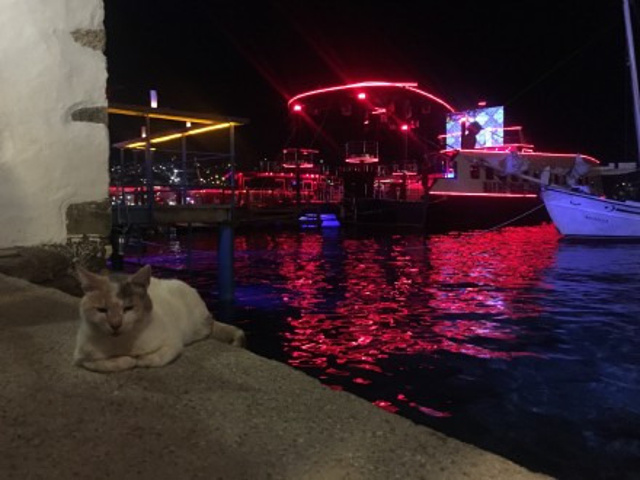 若是夜晚来此,绝对拥有博德鲁姆最美的夜景,许多客人都是乘坐快艇来此,一边是被灯光投射的古城堡,一边是现代感十足足够容纳2000人的船坞disco,脚边都是猫,为你盘中的鱼留步。