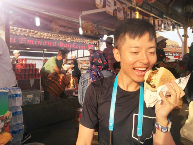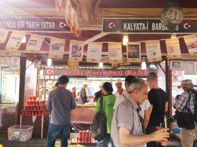 在加拉塔桥下,有许多卖鱼的小贩,乘着船搭起铺位,一面烤着才打捞上 来的鱼,一面做成鱼肉三明治。这是一道属于伊斯坦布尔最大众的美食,随便哪一家,味道都超级鲜,比各种肉卷好吃一万倍,价格9里拉。