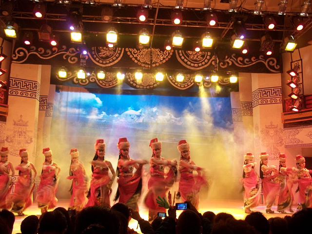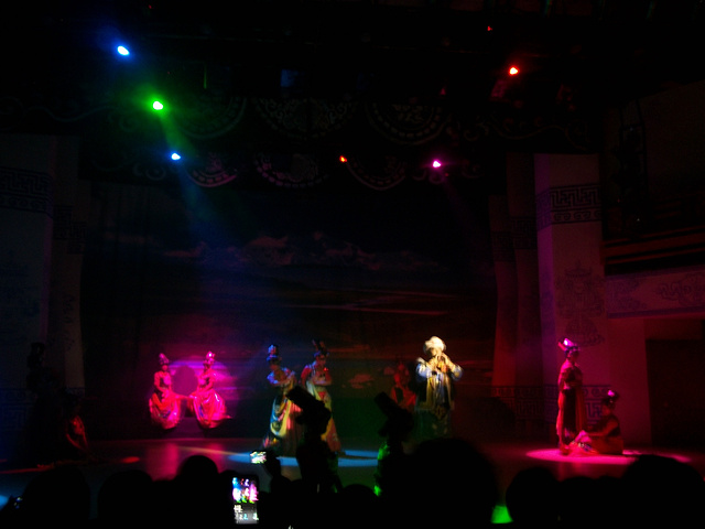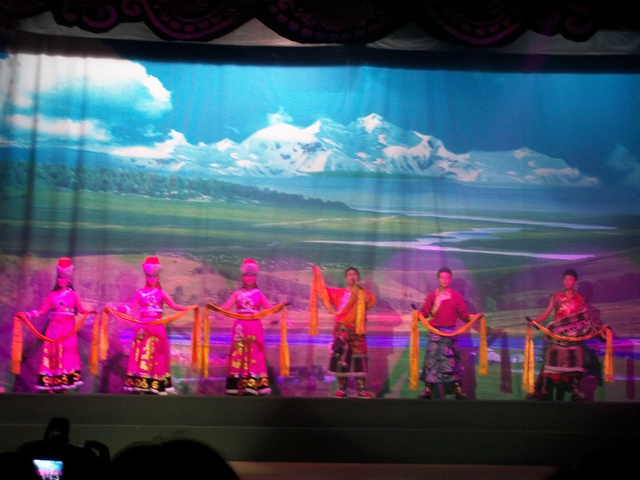 回去休息了一会,自己解决了晚餐。晚上参加了藏羌晚会,开始并不抱什么兴趣,可是节目却很精彩,看得我们津津有味。最让我感觉到的是,藏族都是俊男美女。