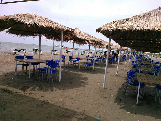新疆的湖水和内地的水比起来真是相差甚远,水边没有一棵树,除了淡淡的湖水以外,就是光秃秃的沙滩。毫不犹豫租下一个棚,确切的说是一张桌子,100元,不分时间,砍价到80元,这天人不多,这片沙滩这片棚全是我们的!