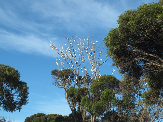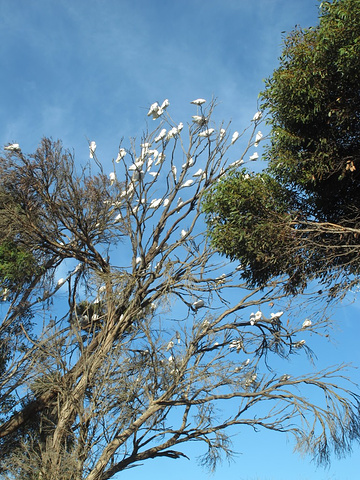 由于接近黄昏,动物们都出来活动,看这棵树,被一群凤头鹦鹉霸占了