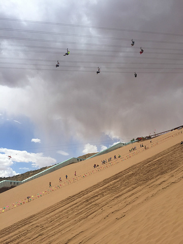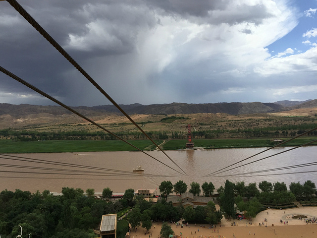 黄河索道,被戏称为“飞黄腾达”。从沙漠向对面快速滑去,再从对面滑到照片下面的建筑。这项娱乐是双向的,很刺激。