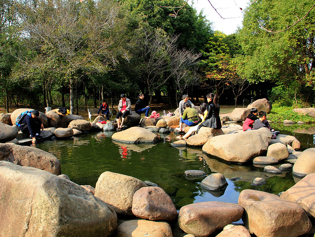泡脚池里是温泉水,池子的四周都是大的鹅卵石,当你走累了,可以停下来歇一歇,坐在大鹅卵石上,脱下鞋袜,把脚泡在温泉里,放松一下,别提有多惬意。